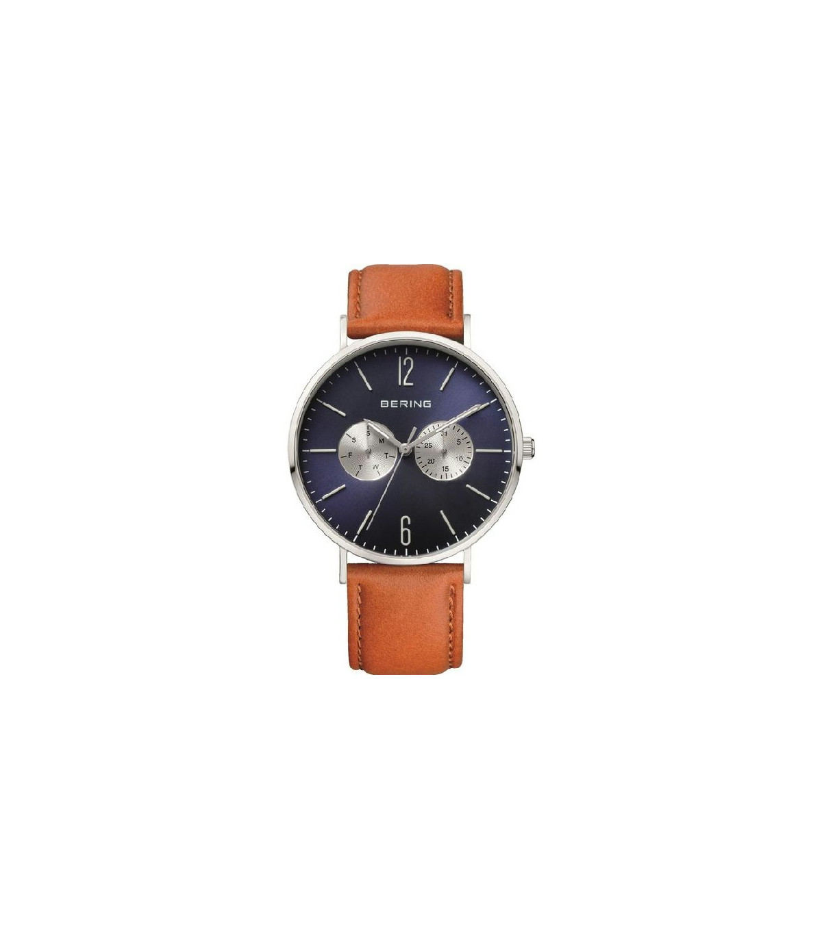 Clásico reloj Bering para hombre con correa intercambiable, caja de acero de 40 mm y cristal de zafiro.Incorpora una correa de cuero marrón y una correa de tela en tono azul.El reloj tiene una garantía internacional de 3 años.