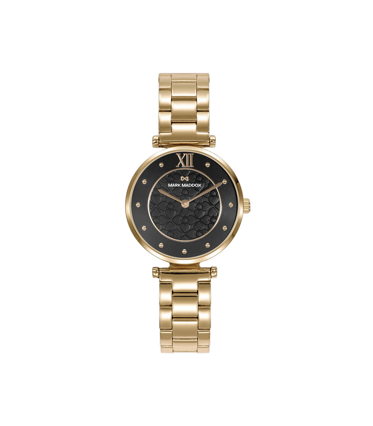 Reloj informal de Mujer Mark Maddox Shibuya, dos agujas, caja y brazalete de acero en Ip dorado, esfera negra con índices y número romano a las 12 de color Ip dorado, agujas horarias en Ip doradas.