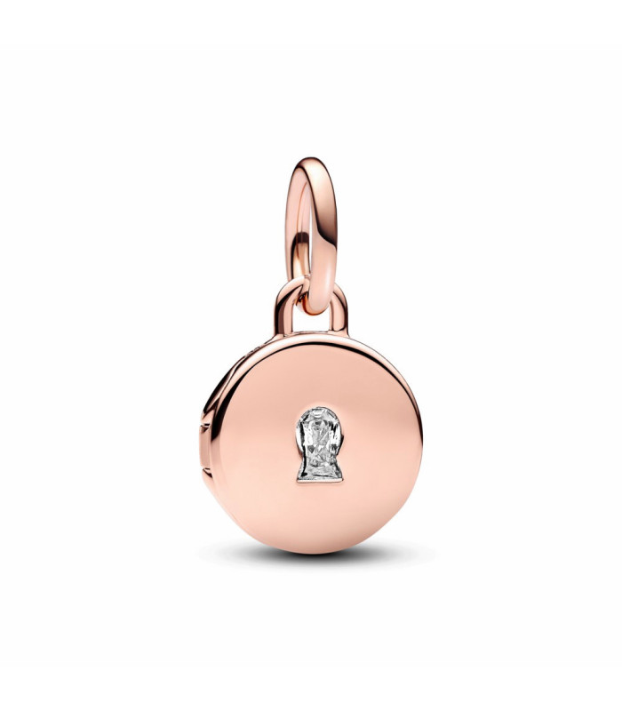 Este charm colgante locket se ha decorado con una circonita cúbica transparente en el frente con la forma del ojo de una cerradura para la llave, que se abre y se cierra de forma segura para que puedas llevar una foto pequeñita, una nota o un mechón de cabello en su interior. El interior del colgante locket se ha grabado el mensaje "TODAY TOMORROW ALWAYS" (Hoy, mañana, siempre, en español), mientras que las superficie del reverso está lisa para que grabes lo que desees. Llévalo en tu collar o pulsera de Pandora Moments como símbolo de mantener tu amor seguro y como recordatorio de que debes atesorarlo todos los días.