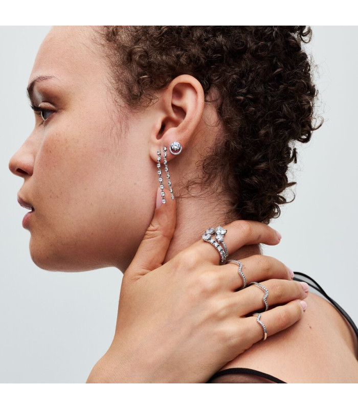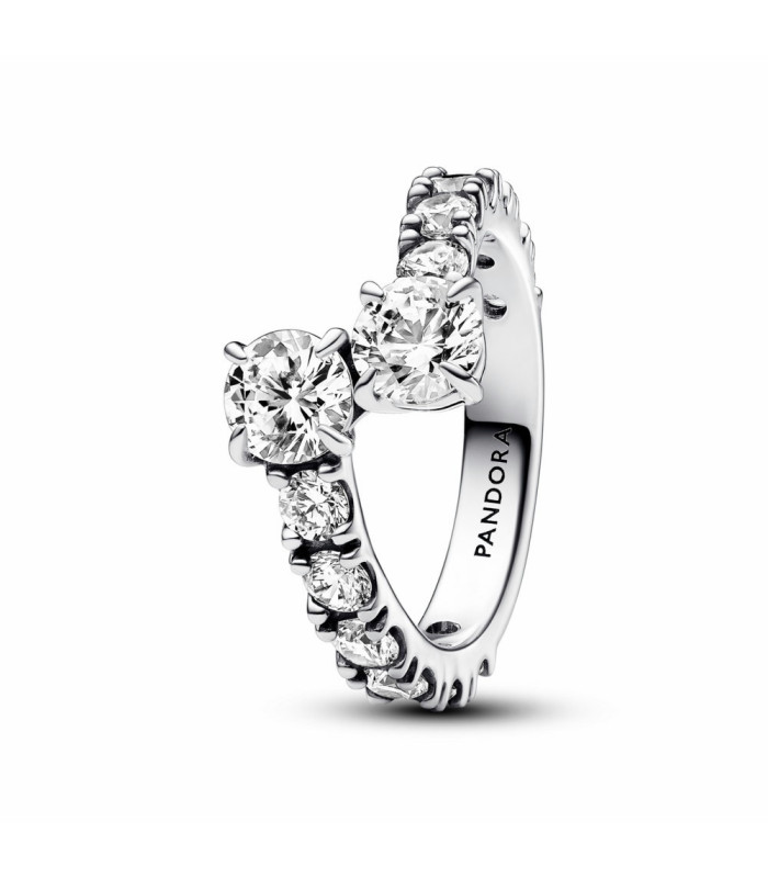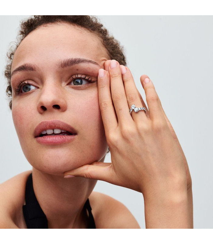 La banda se superpone sutilmente en el centro, con gemas más grandes en cada extremo, formando una pieza central llamativa. Inspirada en los Anillos Eternity Fila Brillante de Pandora, este es un diseño audaz y dimensional. Eleva tu estilo con este exquisito anillo en plata de primera ley.