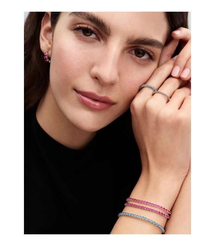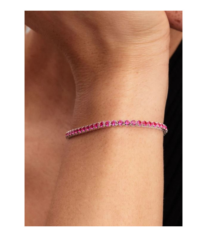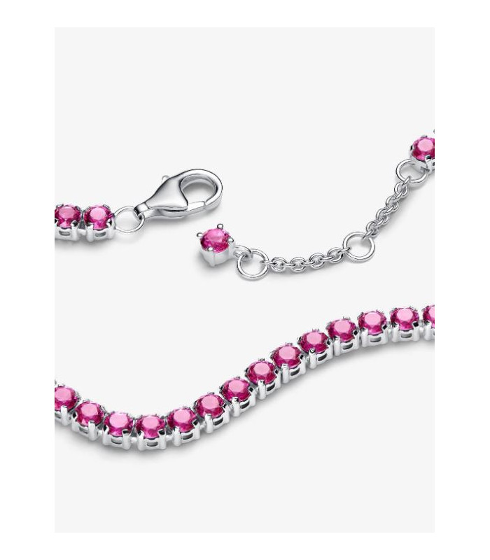 Agrega un toque de elegancia a tu look con una pulsera tenis sofisticada que se presenta con una fila de gemas redondas y una gema más pequeña colgando del cierre, un diseño perfecto para llamar la atención.