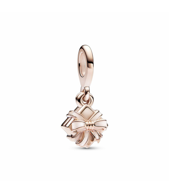 El Charm Colgante Regalo de Cumpleaños que se abre presenta acabado con un cálido recubrimiento de oro rosa de 14k y tiene la forma de una caja de regalo con una cinta y un lazo embellecidos con esmalte de suave color rosa.
