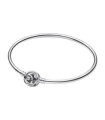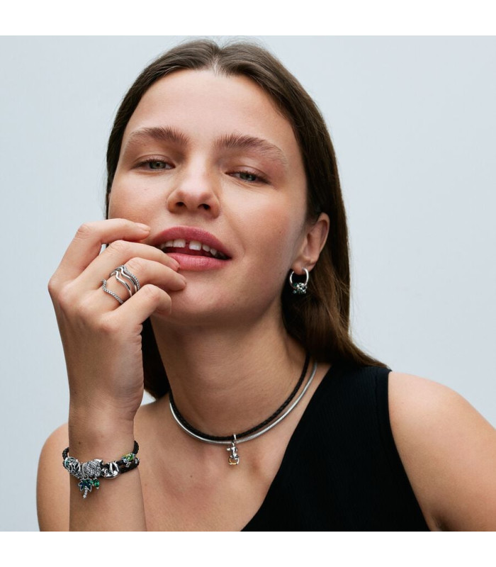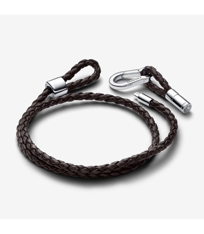 La correa de piel trenzada de color marrón da dos vueltas a la muñeca y se cierra con un cierre de mosquetón en plata de primera ley con el logotipo de Pandora grabado en ambos lados. Ajuste la pulsera mediante una tapa metálica deslizante en un extremo de la pulsera  añade y asegura los charms mediante usando la tapa metálica que se puede abrir en el otro extremo. Personaliza esta pulsera contemporánea con hasta 16 a 18 charms o charms colgantes.