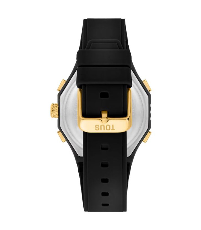 Reloj analógico/digital TOUS Bet de acero dorado y brazalete nylon endurecido en color negro. Esfera metálica con pantalla LCD con luz. Cristal mineral redondo plano. Diámetro: 42,5 mm x 49,5 mm. Funciones: hora, minutos segundos cronógrafo 1/100s, alarma, cuenta atrás, hora 12/24h, día, mes y día de la semana. Impermeable a 10 ATM. Movimiento analógico/digital. Cierre hebilla.